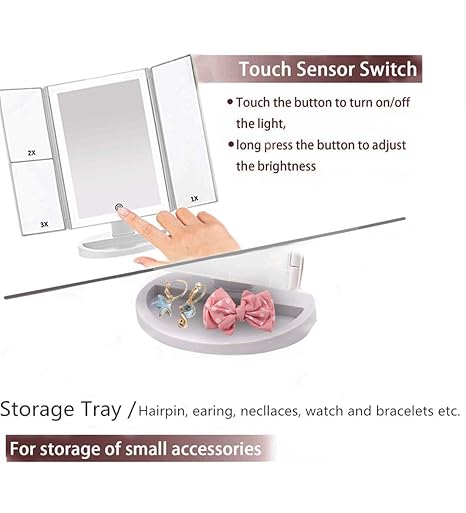 36 LED Nature Daylight Lighted Makeup Mirror,Tri-Fold Lighted Makeup Mirror with 3X/2X Magnification and Touch Screen Dimming Makeup Mirror, 180 Degree free Rotation, Countertop Cosmetic Mirror